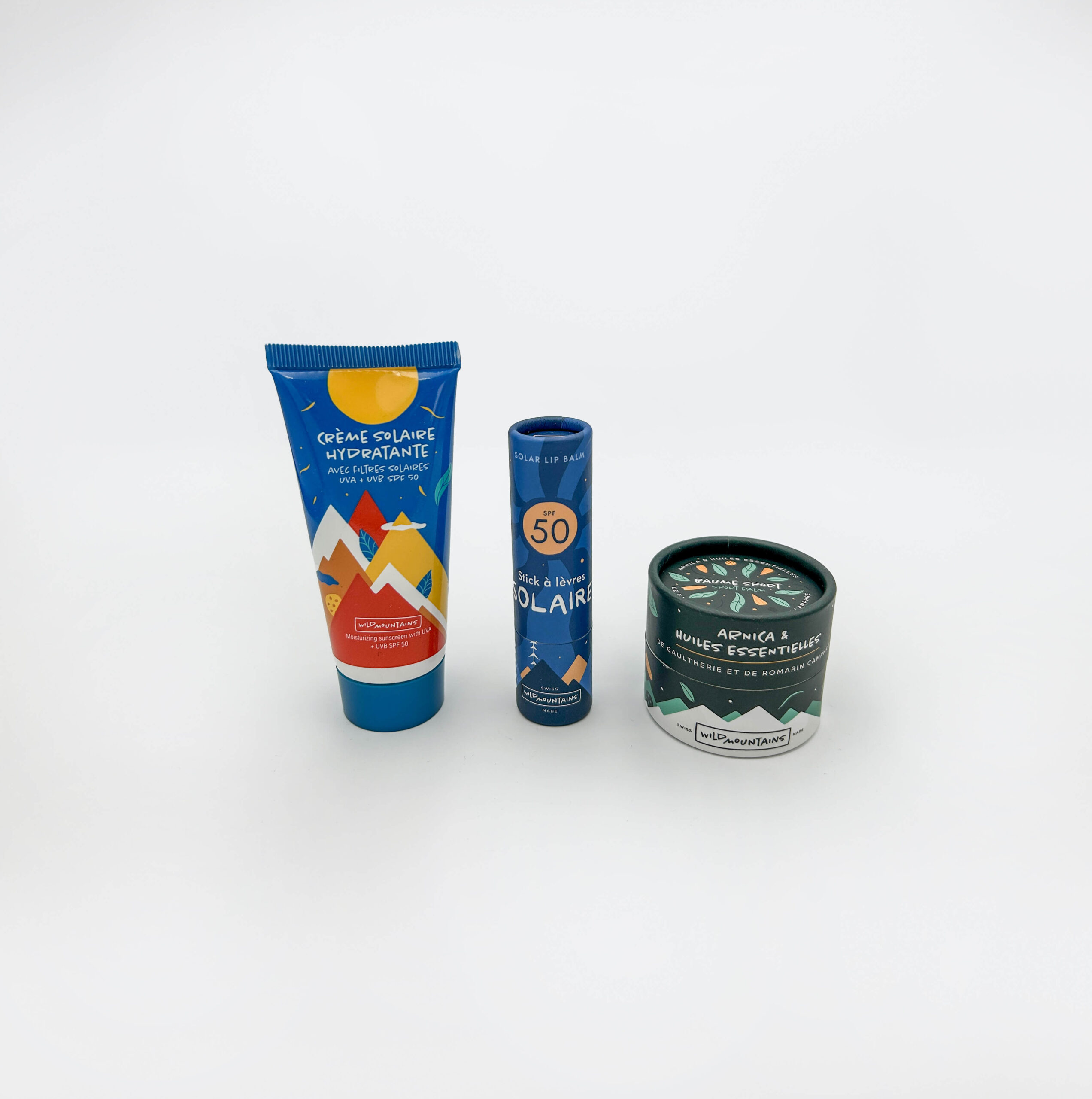 1 crème solaire , 1 stick lèvres solaire, 1 baume sport Le Pack Randonneur est le cadeau pour randonneur idéal : une crème solaire minérale, un stick lèvres solaire et un baume sport à l’arnica. Protection, confort et récupération après l’effort, avec des produits naturels, éco-responsables. Les 3 produits vous sont livrés dans un sachet en coton pratique et parfait pour un cadeau.